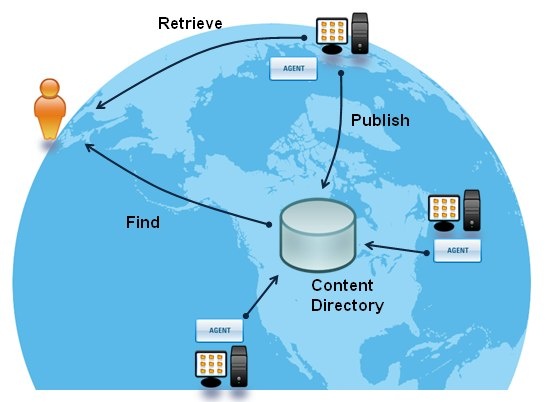 具体的にどのような仕組みか説明しましょう。複数のサーバーに情報が散在しているのが図3の状況です。まず、それぞれのサーバーにCIPのエージェントをインストールしておきます。このエージェントが、各コンテンツのメタデータを整理して仮想的なディレクトリ(Content Directory)に渡しています。Webサイトを制作をしていて何か必要なコンテンツがある場合は、このディレクトリに対して検索をかけます。必要なコンテンツが見つかったら、本来の保管場所からエージェントを通して入手するという仕組みです。GoogleがインデックスしたWebページを検索するのと同じイメージです。