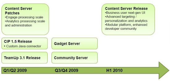 ●ドミトリ 今後のロードマップですが(図4)、2009年の前半にCIP 1.5とTeamUp 3.1をリリースします(6月15日に日本も同時発売)。CIP 1.5は、CIP1.1の機能に加え、新たに各リソースシステムへのJavaによるコネクター開発を可能にするものです。2009年の後半には、先ほど説明したGadget ServerとCommunity Serverが出ます。2010年以降、Content Server 8が出ます。ContentServer 8が目指すのは、Gadget、Communityをマーケッティングインフラとして提供するサーバー製品になっていくということです。
