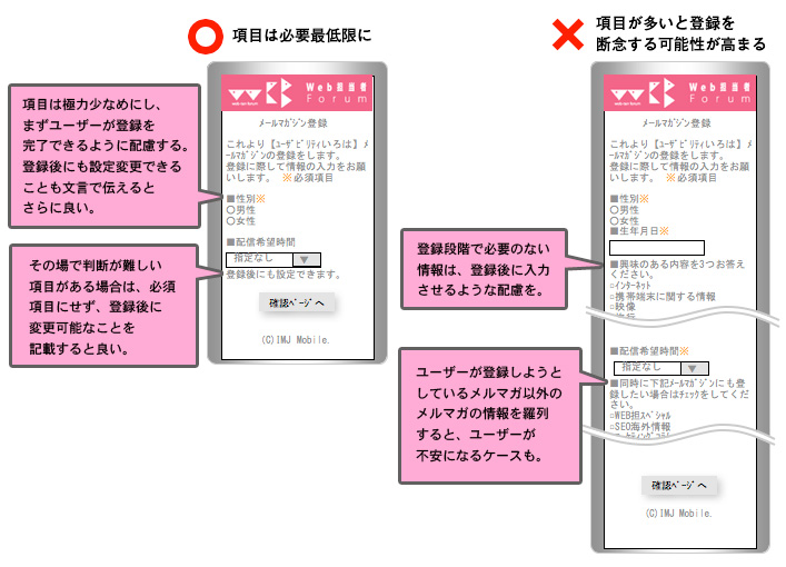 ユーザーからメールアドレスを取得した後、最終的な登録完了までにユーザーの個人情報を入力してもらう場合は、入力内容を必要な情報のみに厳選しましょう。必要以上に個人情報の登録項目数が多いと、登録が完了する前に断念してしまうユーザーは少なくありません。そのため、登録完了前に情報の入力をしてもらう場合には、必要な情報のみを入力させ後からユーザーが内容を追加・修正できるよう配慮しましょう。