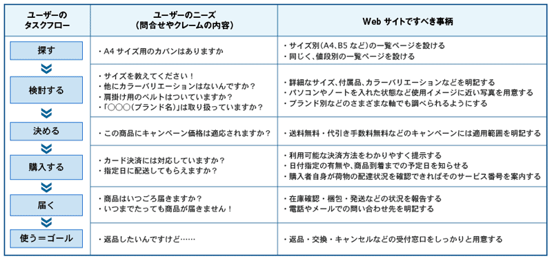 問い合わせやクレームをユーザーシナリオにマッピングして分析する際は、その内容を「ニーズ」に変換するといいでしょう。「○○するにはどうしたらいいかわからない」という問い合わせ内容は「○○する方法を知りたい!」というニーズの表れだと捉えられます。ユーザーシナリオを活用して問い合わせやクレーム(=ユーザーのニーズ)を整理することで、ユーザーが成し得たい事柄に対してWebサイトでは何をしなければならないか、抜け漏れなくリストアップできるのです。