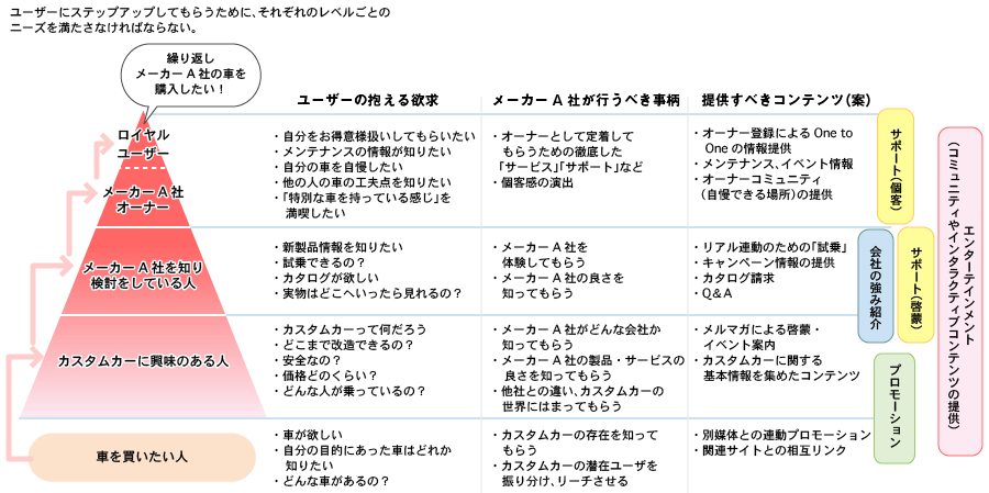 その企業の潜在顧客(三角形の底辺)からロイヤルユーザー(三角形の頂点)までを整理し、各ステージにいるユーザーのニーズを満たし、次のステージへステップアップの動力となるコンテンツを企画するものです。そのステージ特有のニーズを満たし、ステップアップをしてもらうことで最終的にはロイヤルユーザーへと育成することを目指します。どこのステージにいるユーザーをターゲットにするのかを定めることで、そこにいるユーザーのロイヤリティ向上に効くサービスやコンテンツに特化することができます。記事の冒頭で「ロイヤリティの向上は、マーケティングやサポートの結果なしには得られない」と説明しました。この図の底辺から1ステージ目の「プロモーション」には、ズバリ前回記事で解説したマーケティング施策が有効といえます。1ステージ目から検討段階にある人には前々回記事のサポートコンテンツが有効なのです。そのうえで最後の段階として、その企業のサービスを利用した人をロイヤルユーザーとして定着してもらうステージにフォーカスをして、「ロイヤルユーザー育成のためのコンテンツ」をまとめてみます。