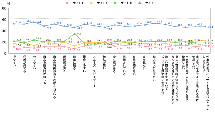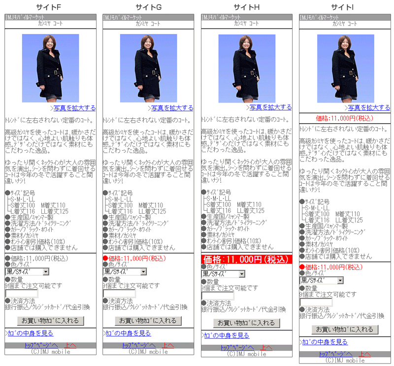 商品ページにおける価格表示の最適なレイアウトを調査するため、価格表示と本文の色が同じサイトFと、価格表示が赤文字のサイトG、価格表示の背景色を赤くして文字を白抜きにしたサイトH、価格表示を赤文字でページ上下に配置したサイトIを比較しました(図11)。