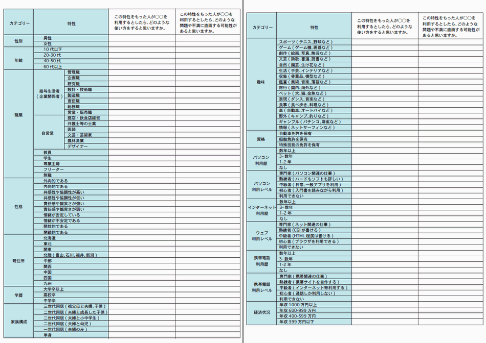 まずは、ペルソナを文章として記述するのではなく、評価対象物の利用に関連性のあるユーザー特性を列挙することからスタートする。ユーザー特性というと、一般に年齢や性別、職業などをリストアップすることになるが、たとえば、「男性」か「女性」かという性別が評価対象物の利用に関係ないと判断された場合には、その特性はリストから削除しても構わない。言い替えれば、ペルソナを使って検討を行う評価対象物ごとに、利用する特性リストのカテゴリが異なることになる。
