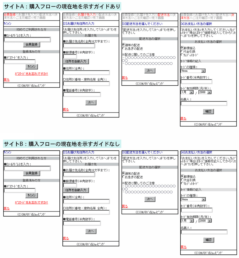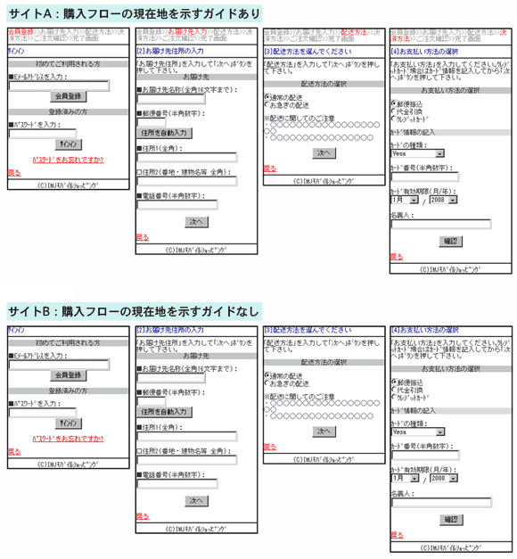 - サイトB:ページ上部に、購入フローの現在地を示すガイドなし