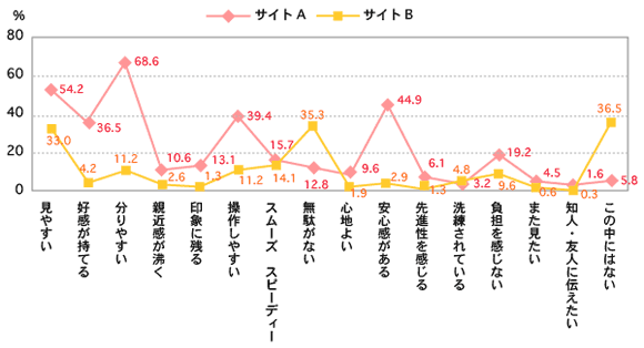 調査の結果、ガイドがあるサイトAの方が、「分かりやすい」「安心感がある」の項目においてサイトBをそれぞれ57ポイント、42ポイント上回る結果となりました。また、操作自体はまったく同じ画面にもかかわらず、サイトAの方が「操作しやすい」「負担を感じない」と感じる人が多い結果となりました(図10)。