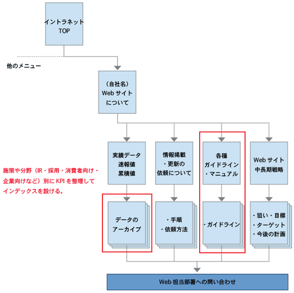 コンテンツホルダーに必要な情報を漏れなく伝えるためのイントラネットの構造図と各種ガイドライン、Web担当部署にサイト制作をお願いする際の申請シートを用意しました。