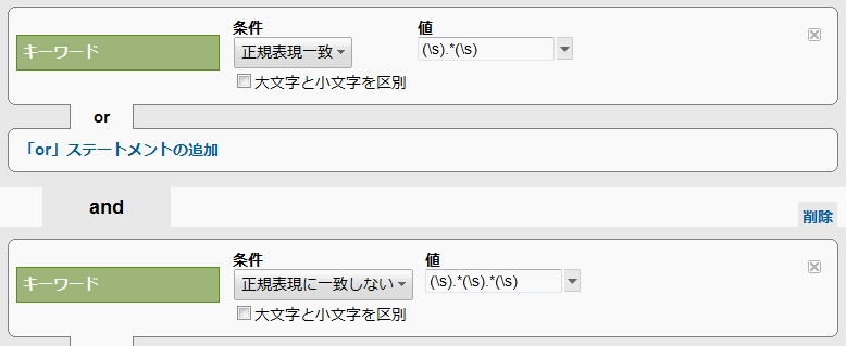 上のキャプチャのように設定すると、「2つのスペースがあり」かつ「3つ以上のスペースがない」というフィルタになる。すなわち「2つのスペースがあるキーワードだけの検索」、言い換えると「3語のキーワードの検索」ということになる。応用すれば、4語、5語とキーワードの数を増やすこともできる。