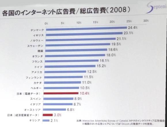 まずは、セプテーニの代表取締役社長、佐藤氏が世界のネット広告市場と日本のネット事情に関する数字をいくつか紹介した。それによると、各国の総広告費に占めるインターネット広告費の比率は、デンマークが24.4%と世界的に最も高く、次いでイギリスが23.1%、ノルウェーが21.1%、スウェーデンが19.5%と、欧州で高いことが伺われた。次いで韓国が18.6%と5位、米国が12.5%と9位に位置している。日本は、電通データによると10.4%と13位(経済産業省データによると3.0%と17位)で、先進国の中では遅れをとっていることがわかる(図1)。