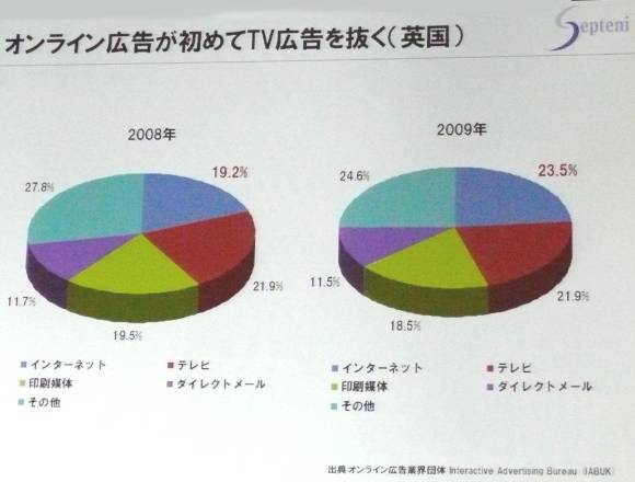 また、英国では2008年から2009年にかけて、TV広告の比率が横ばい(21.9%)だったのに対して、インターネット広告は19.2%から23.5%に伸びている。つまり、英国ではネット広告がTV広告費を抜いたのだ。インターネット広告が登場して十数年ということを考えると、非常にエポックメーキングなことだ(図2)。