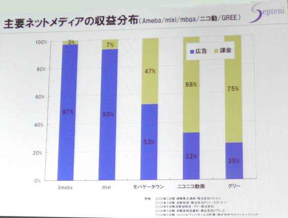 次に、国内のネット事情については、ネットメディア、特に主要ソーシャルメディアの収益構造がどうなっているか、広告と課金の比率を比較したグラフが紹介された(図3)。