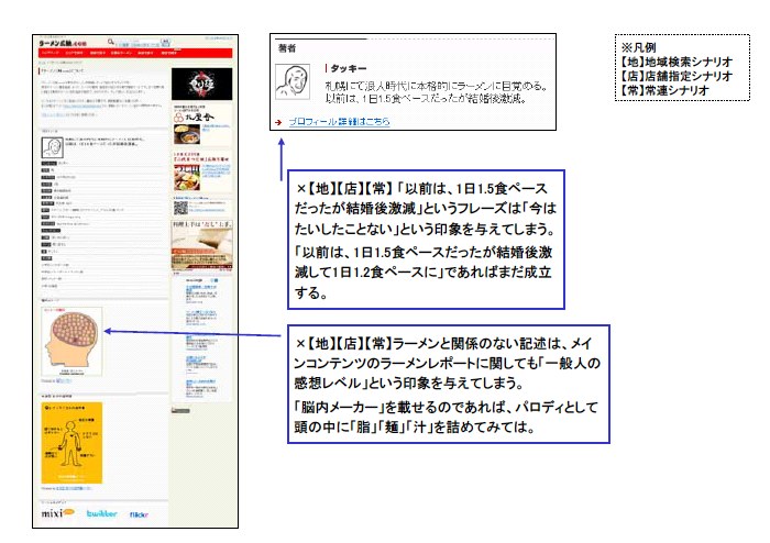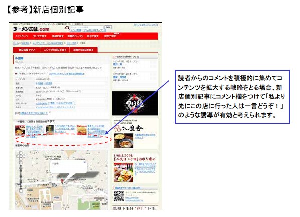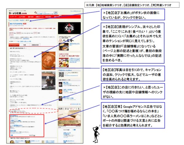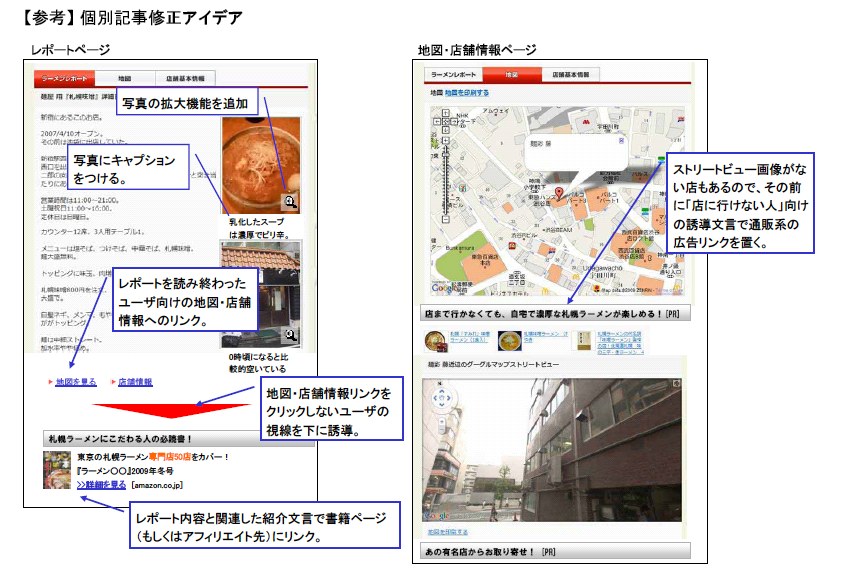 文章や写真といったコンテンツ自体でユーザーの気持ちを盛り上げる努力が必要であるだけでなく、コンテンツを読み終わって「この店に行きたい」と思ったユーザーには地図や店舗情報へのリンクを見せたり、「もう少しこの店(もしくはラーメン)のことを知りたい」と思ったユーザーに、「もっと詳しい情報はこちら」などという文言で書籍や雑誌購入に誘導したりすることが可能と考えます。