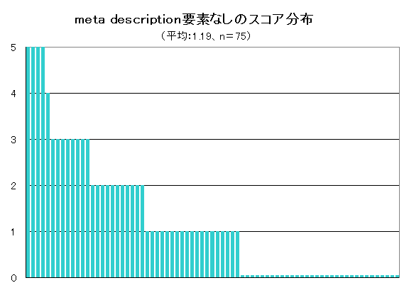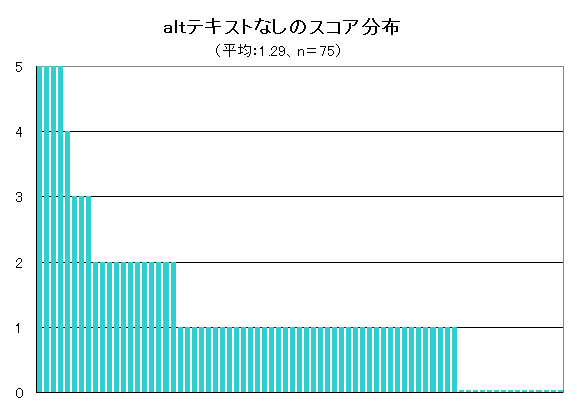 最も平均スコアが低かったのは、「meta descriptionなし」「altテキストなし」の項目(グラフ6、グラフ7)。meta descriptionは検索エンジンの検索結果ページでスニペットとして表示されることが多く、検索結果画面でクリックしてもらうためには重要な要素だが、75サイト中32サイトでは調査対象の半数以上のページで設定されておらず、うち、まったく設定されていないサイトが14サイトと、成績が悪かった。