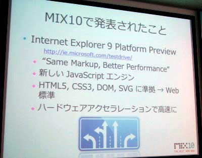 基調講演2日目では、Internet Explorer 9について発表。IE9では新しいJavaScriptエンジンを採用し、バックエンドで動かすことで高速化を計るほか、Web標準準拠にかなり力を入れていくとのこと。IE9のプレビュー版はすでにダウンロード可能で、長坂氏はインストール後、簡単にアンインストールできるのでぜひ試してほしいと紹介した。