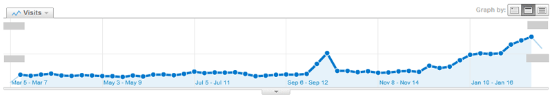 さまざまな問題がある(グーグルのベストプラクティスが最善のソリューションとならないケースも依然としてある)ローカル検索ではあるものの、ローカル検索に掲載されることで相当数のトラフィックが生み出され、価値あるものとなってきた(アップロードファイルが確認されたのは2009年11月の後半だったが、それから堅実な増加が始まっている)。