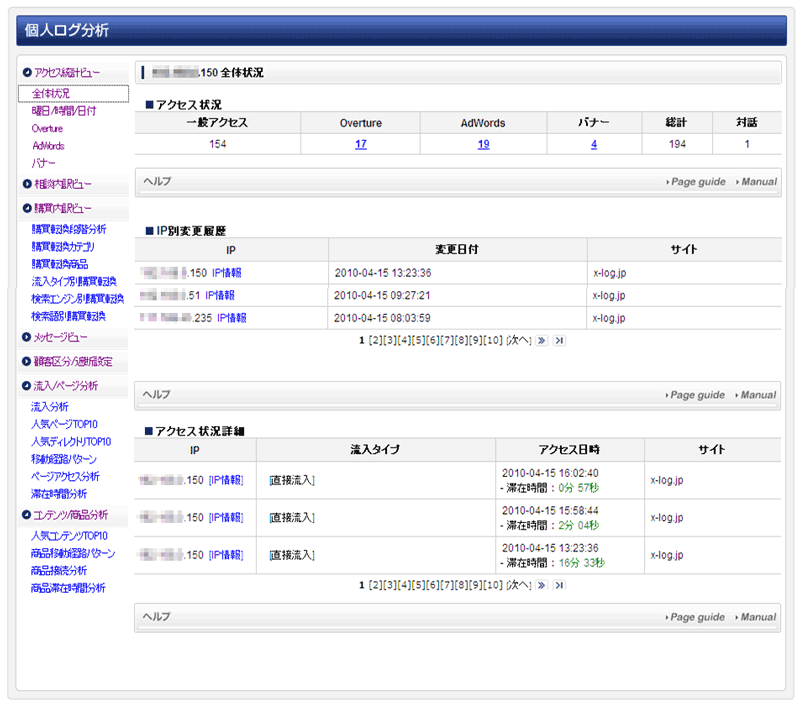 つまり、アクセス解析で一般的な、クッキーをベースにしたユニークユーザーの識別は、現状ではかなり不正確である可能性が高いのだ。X-logでは、各種の情報を利用してユニークユーザーを判断できるという。英語圏のアクセス解析ツールでは全体のおおまかな流れをチェックすることが中心で、訪問者ごとの経路確認ができないものも多いが(Google Analyticsもそうだ)、さすがに日本向けに作られているだけあって、日本で要望の多いユーザーごとの行動を確認する機能はしっかり備えられている。