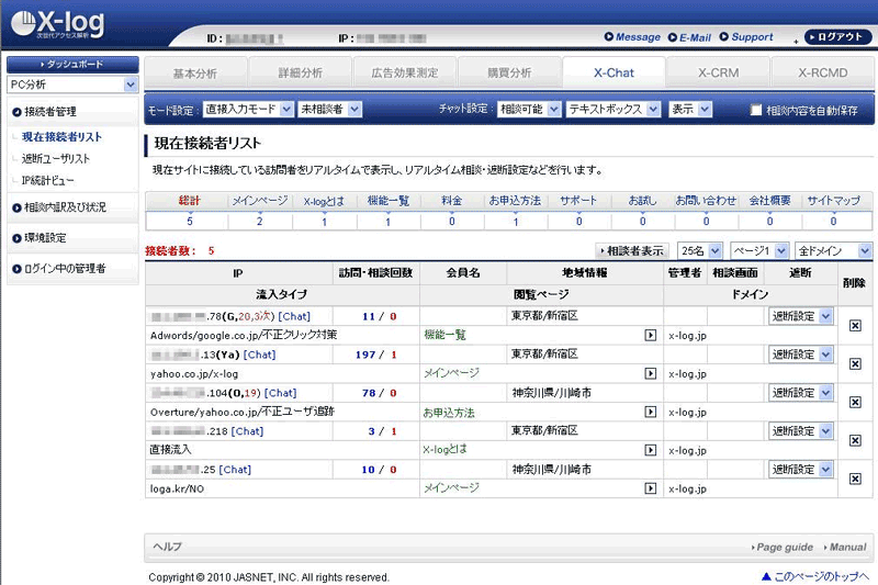 X-logはJavaScriptビーコン型ながら、リアルタイムに近い状態でアクセス状況が管理画面に表示される。実際に、「現在接続者リスト」の画面では、いまアクセスしている人の一覧が、流入経路や閲覧中のページとともに表示される。