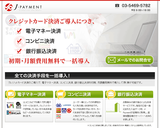 決済代行事業を行うJ-Payment(本社東京)は4月15日、クレジットカード決済に加えてコンビニ決済、銀行振込、電子マネー決済を一括して導入できる「決済一括導入プラン」の提供を開始した。複数の決済手段を購入客に提供したいというECサイトが増えていることに対応した。追加費用なしでカード以外の決済が導入できる。