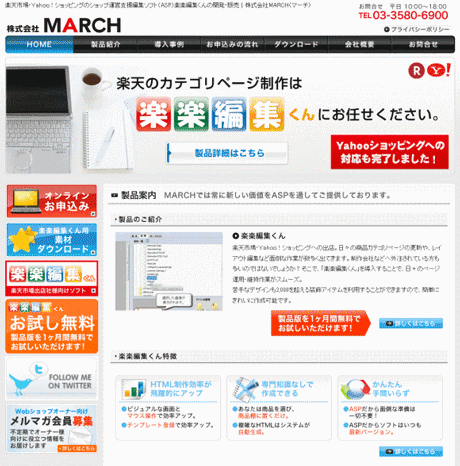 システム開発のMARCH(本社東京)は、楽天市場店、ヤフーショッピング店のページ編集作業を効率化できるソフトを開発し、5月18日から販売を開始した。楽天市場店向けに特化していた従来のソフトをバージョンアップした。ソフト名は「楽楽編集くん」。各店舗内にあるカテゴリーページと呼ばれるジャンル別の商品紹介欄を独自デザインで作成し、更新・編集作業を効率化する。