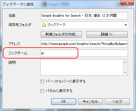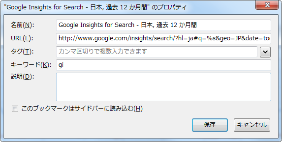 ポイントは、ブックマークに設定したキーワードの「gi」と、URLのなかの「%s」(ここでいう「キーワード」はSEOとは関係のない、Firefoxの用語です)。