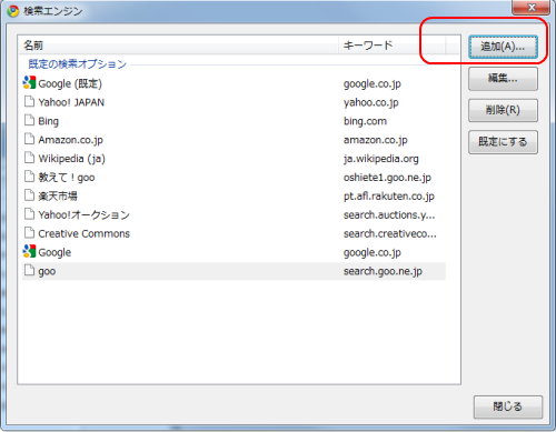 [検索エンジン]ダイアログボックスで[追加]をクリックする。