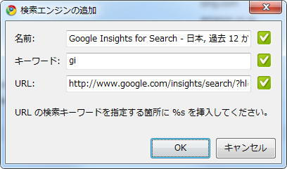 上記Firefoxのやり方と同じ名前、キーワード、URLを入力する。