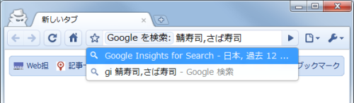 | Google Insights for Search | gi | 「gi 鯖寿司,さば寿司,サバ寿司」のように検索ボリュームを調べたい検索キーワードを指定(複数ある場合はカンマ区切り) |