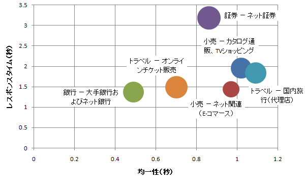 6業種の傾向を見てみると、銀行業界は良レスポンスを常に保っており、次に高速なのがトラベル(オンラインチケット販売)と小売(Eコマース)。証券はレスポンスタイムが遅いが、総じて可用性が高かった。