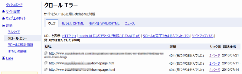 Googleウェブマスターツールで、404エラーを起こしているページを調べる。