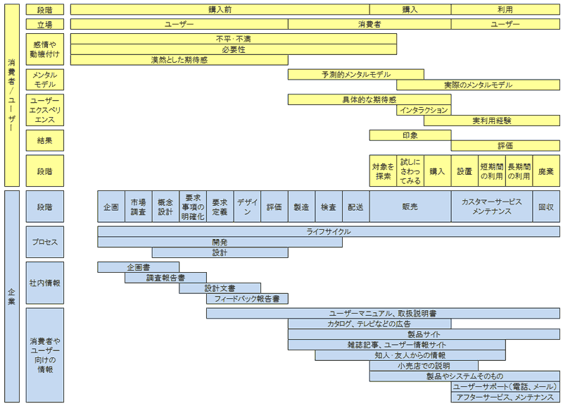 この図は、2010年5月あたりから講演などの場でよく利用しているもので、上半分がユーザー(購入以前は消費者)で、下半分が企業になっている。また左から右に移るにつれてライフサイクル(主にプロダクトを念頭においている)の各フェーズをたどるようになっている。