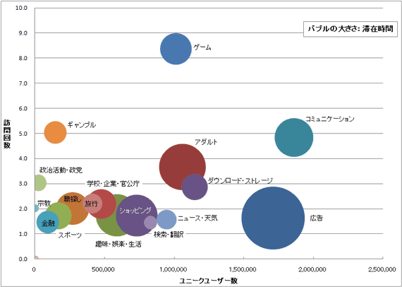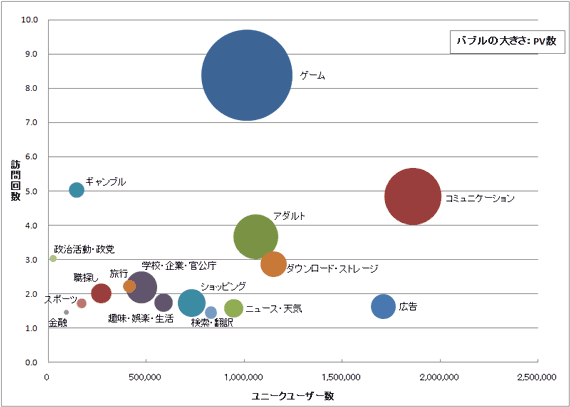 しかしながら、訪問回数やページビュー数に目を移すと、ゲームカテゴリの数が圧倒的に多いという傾向が出る。ゲームコンテンツは、利用比率は小さいながらも、積極的に利用するユーザーが多く利用頻度が高いということが理解できるだろう。