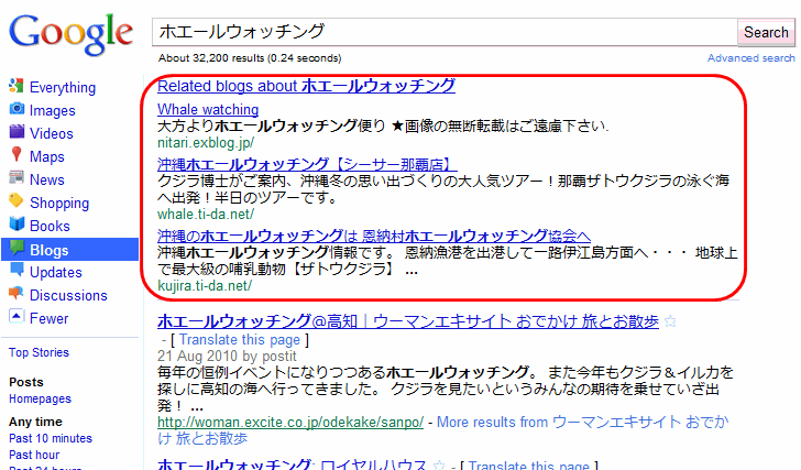 (Official Google Blog)検索キーワードに関連のある「ページ」ではなく関連のある「ブログ」をグーグルで探せるようになった。ブログ検索ではなく、通常のウェブ検索の機能だ。日本語での検索にも対応しているが、現在は日本語インターフェイスでは利用できない(検索設定で表示言語を英語にすると利用できる)。