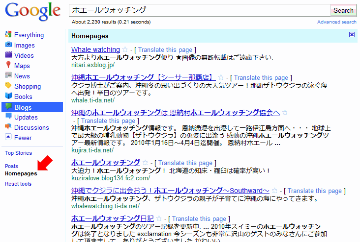 英語版ウェブ検索で検索した検索結果ページで、左サイドのナビゲーションメニューから検索対象を「Blog」に絞り込み、さらにその下に出てくる「Homepages」を選択する。すると、検索キーワードをテーマにしたブログ(サイト)が検索結果に表示される。