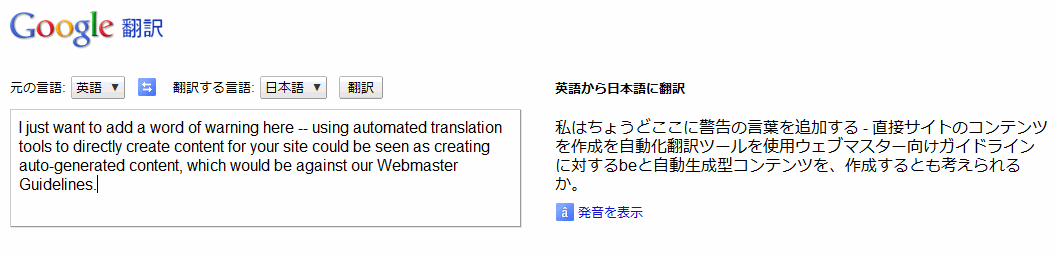 (Google Webmaster Central Help Forum)グーグル社員のジョン・ミューラー氏によれば、たとえGoogle翻訳といえど、翻訳ツールで訳したコンテンツをそのまま公開するのは自動生成ツールでコンテンツを作ったことと同じでグーグルのガイドラインに違反しているとのことだ。そのページをインデックスから取り除くかもしれないし、ツールを使った複数の言語の翻訳コンテンツがサイトの大部分を占めているようならサイトごとインデックスから削除することもあり得るとも警告している。