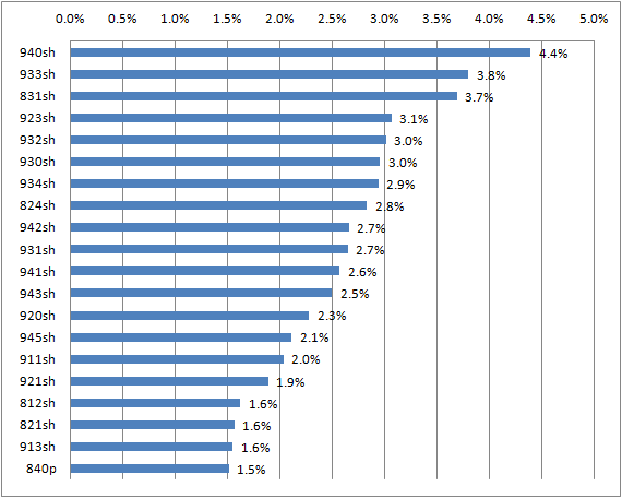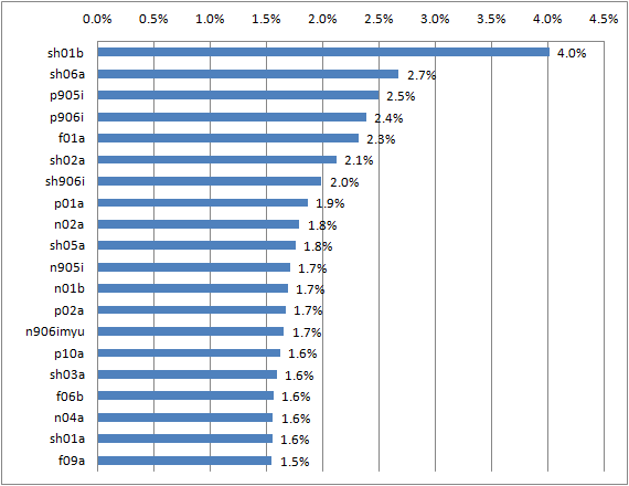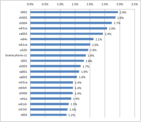 携帯電話機種別のランキングに目を移すと、auで「K002」がトップになっているのが特徴的だといえる。K002は薄さを重視し、機能的にはミドルクラスだといえる端末。auの中でも、最近価格の手頃さで販売が好調となっている。