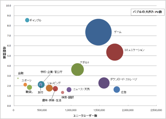 全般的にページビュー数やユニークユーザー数などが減少するなか、伸びているのが「ゲーム」と「ダウンロード・ストレージ」の2つのジャンル。「広告」など無料系のコンテンツ利用が減少していることから、有料系のコンテンツ利用が回復基調にあると見ることができそうだ。