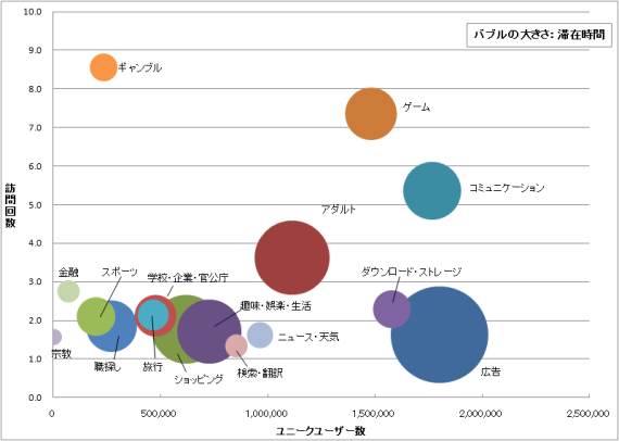また値そのものは小さいが、「政治活動・政党」ジャンルのページビュー数や滞在時間などが大幅に伸びているのも特徴的だ。これは同月に起きた、尖閣諸島における中国漁船衝突事件が大きな話題となり、政治に対する関心が高まった影響だと考えられる。