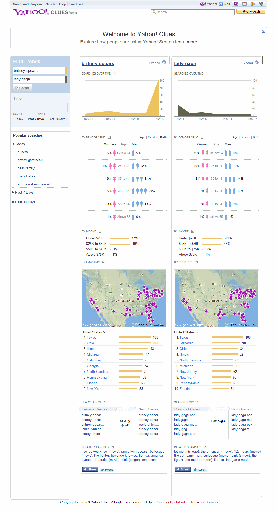 (Yahoo! Search Blog)米ヤフーは、「Yahoo! CLUES」(ヤフー! クルー)というツールを公開した。Yahoo.comでの検索動向のデータを調査できるものだ。当日/過去7日間/過去30日間の検索ボリュームの推移がわかるほか、性別/年代、収入、地域・前後に行った検索キーワードの情報も調べられる。