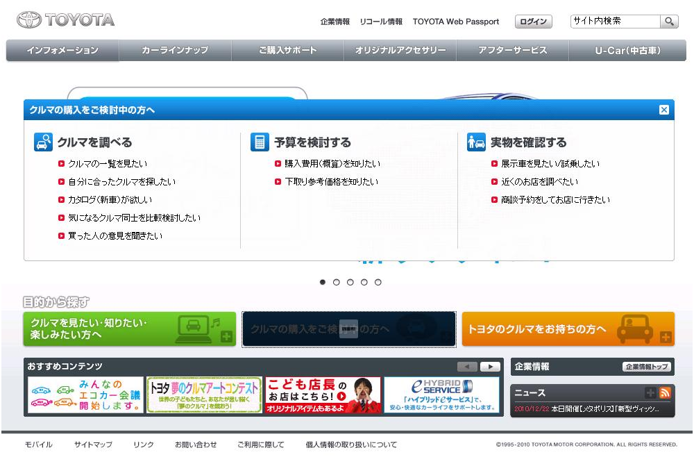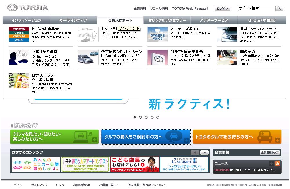 グローバルナビゲーションをマウスオーバーして表示される各コンテンツのメニューがすべて名詞で統一されている一方、「目的から探す」をクリックして表示されるコンテンツはすべて動詞で統一されているなど、言葉使いは統一感がある。