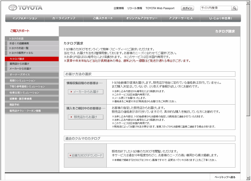 トップページの「目的から探す」の2番目にある「クルマの購入をご検討中の方へ」をクリックして出てきたメニューの中から「カタログ(新車)が欲しい」をクリックしたのが下記画面(図6)だ。左側のナビゲーションがグレーのバックに白抜き文字など、やはり視認性が低いという難点は残っている。