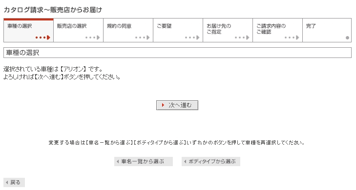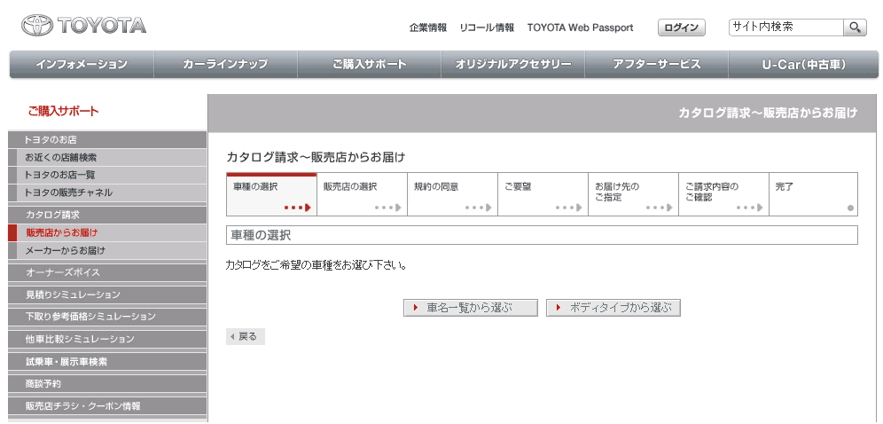ここでは、「販売店からお届け」と選択したという前提で、クリックして進んでいくと、図10のページへ移動する。「カタログ請求したいだけなのに、7つもステップがあるのか!」というのが第1印象だ。