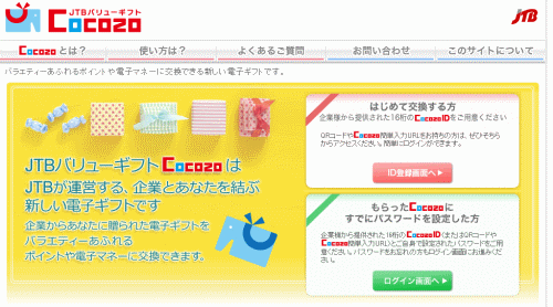 利用者が「COCOZO ID」を購入すると、電子メールやIDが記載されたカードが送られる。〈JTB COCOZOサイト〉で、ID情報を確認すると、ネットスーパーや家電量販店のポイント、電子マネーなどに変換することができる。