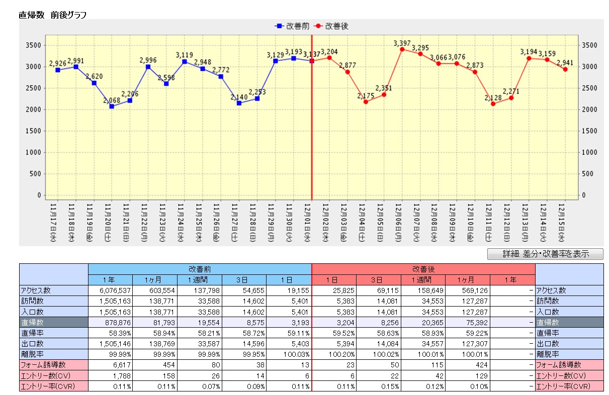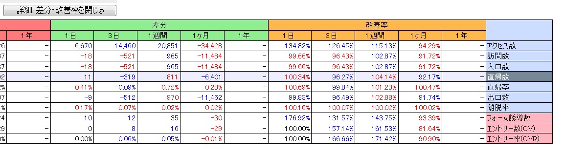 このようにあるページに対して、改善日を設定する事で、その前後1日・3日・1週間・1か月・1年の各指標を比較できます。指標はアクセス数・直帰率・離脱率・エントリー率などを確認できます。