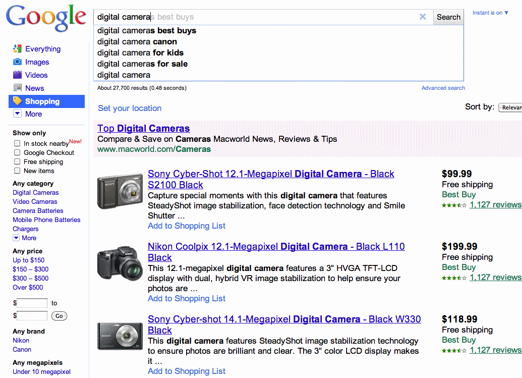 日本は? 日本は? (Google Official Blog)昨年9月に米グーグルで開始した「Google Instant」(日本語名:インスタント検索)が、ショッピング検索にも導入された。検索カテゴリにショッピングを選択すると、検索キーワードを先読みして商品写真付きの検索結果をリアルタイムで更新する。