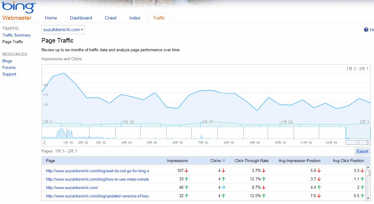 Bingウェブマスターツールで検索順位やクリック率がわかるように