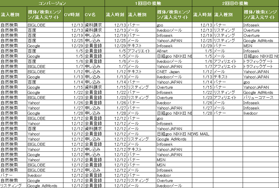 たとえば、リスティング広告をクリックしてコンバージョンに至ったユーザーでも、実はその3か月前にバナー広告をクリックして商品情報を見ていて、その後アフィリエイトのページを見て興味をもちサイトを訪れていたかもしれない。または、ある広告から特定の解説ページを見た人は、その後、指名買いの検索を行う率が高いかもしれない。