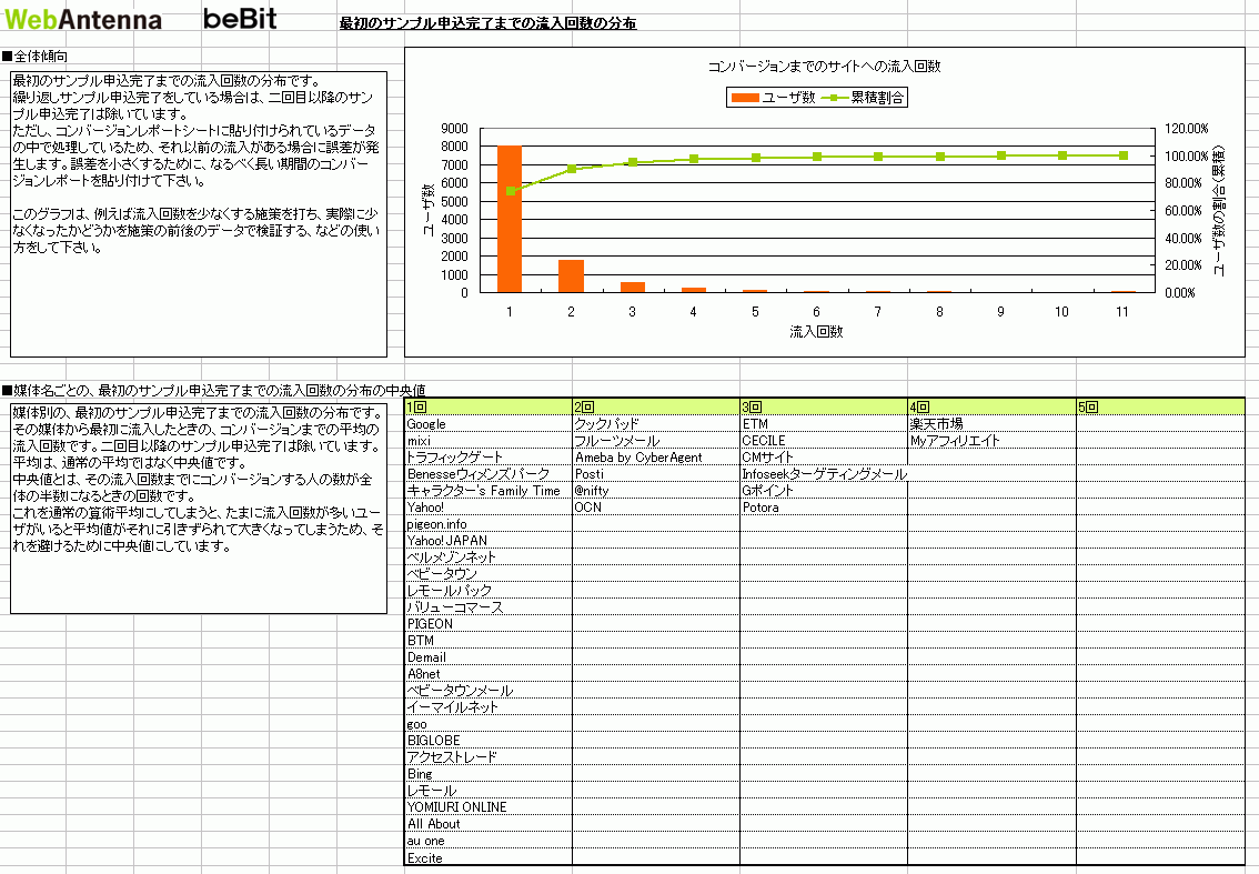 これは「ユーザー行動分析ツール(β版)」と呼ばれるExcelワークブックで、ウェブアンテナからダウンロードしたコンバージョンレポートを取り込むと、間接効果(アトリビューション)に関する分析を行い、レポートを表示してくれるものだ。