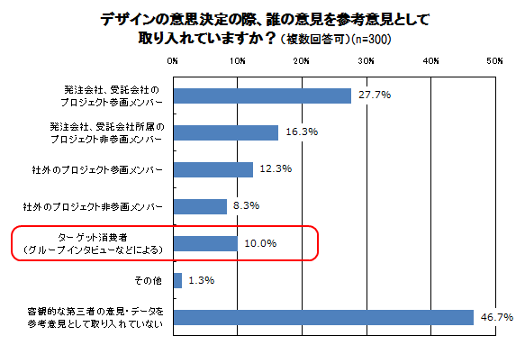 参考意見としてターゲット消費者の意見を取り入れているのは10%に過ぎず、90%が消費者の意見を聞かずにデザインを決定している。