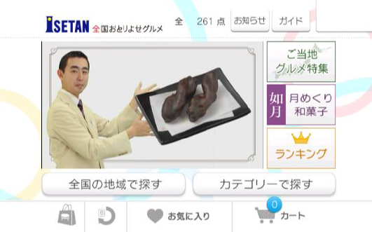 伊勢丹(本社東京)は2月8日、任天堂のゲーム機「Wii」のネット機能を使って買い物ができる〈Wiiの間ショッピング〉に出店し、約260点の全国おとりよせグルメの販売を開始 した。