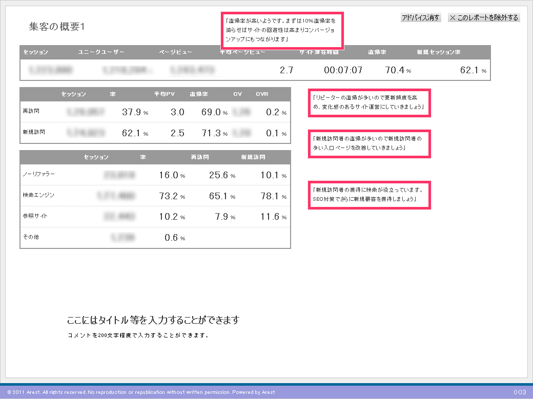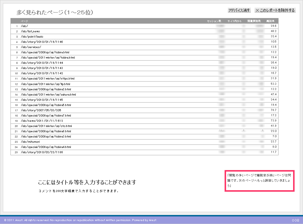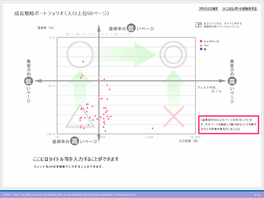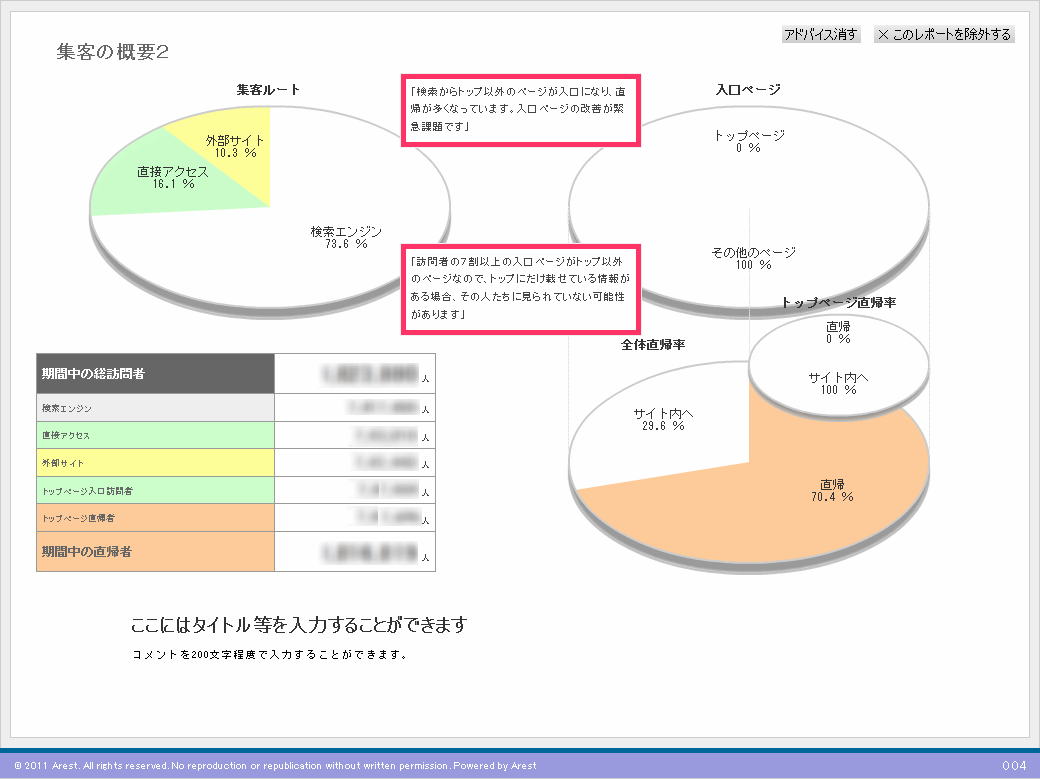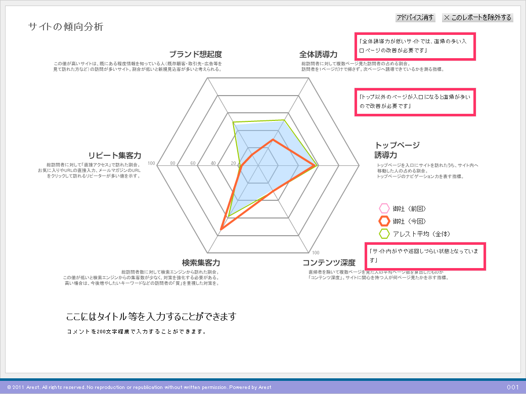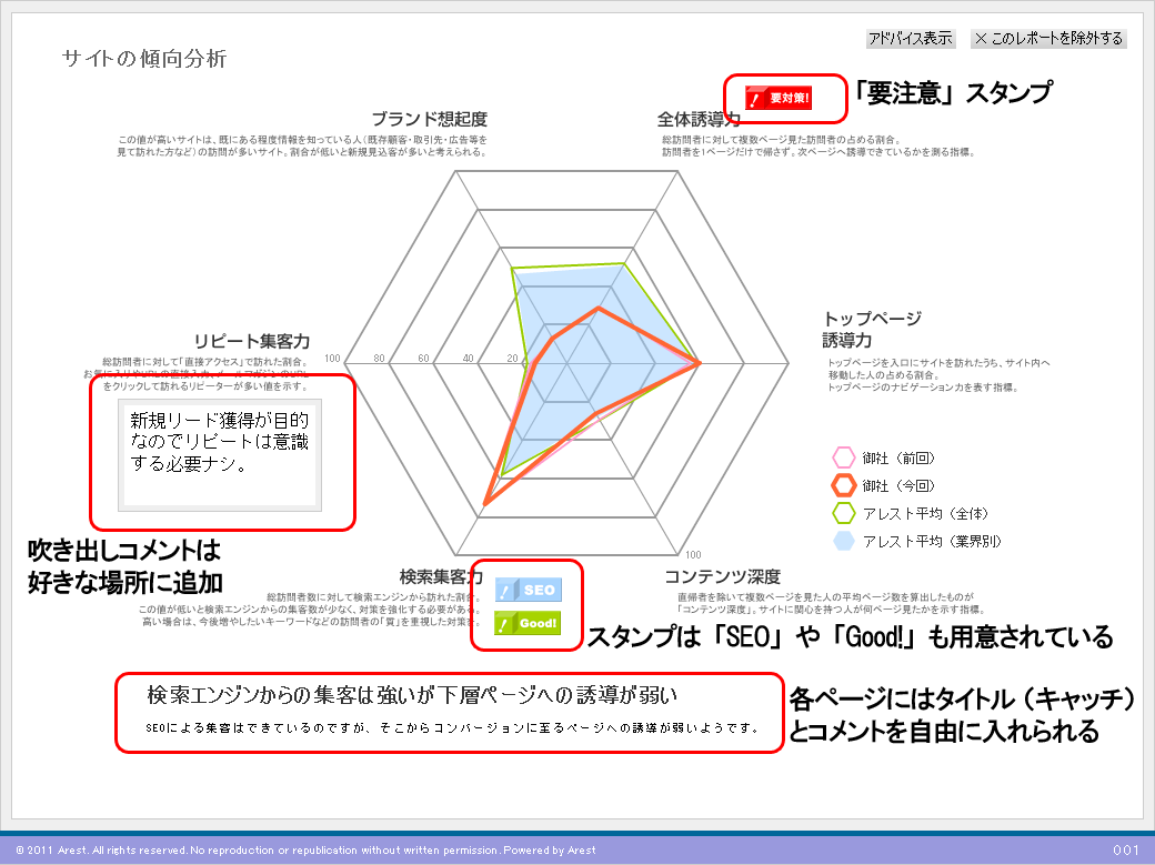 レポート例の図のなかで赤枠で囲んだコメントが表示されているものがあるが、これはアレストの自動アドバイス機能によってレポート上に表示されているアドバイスのメッセージだ。