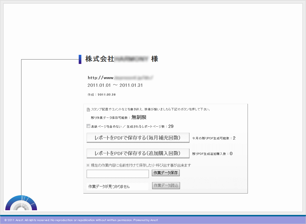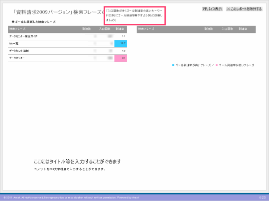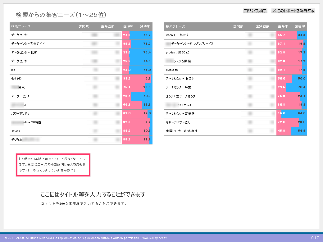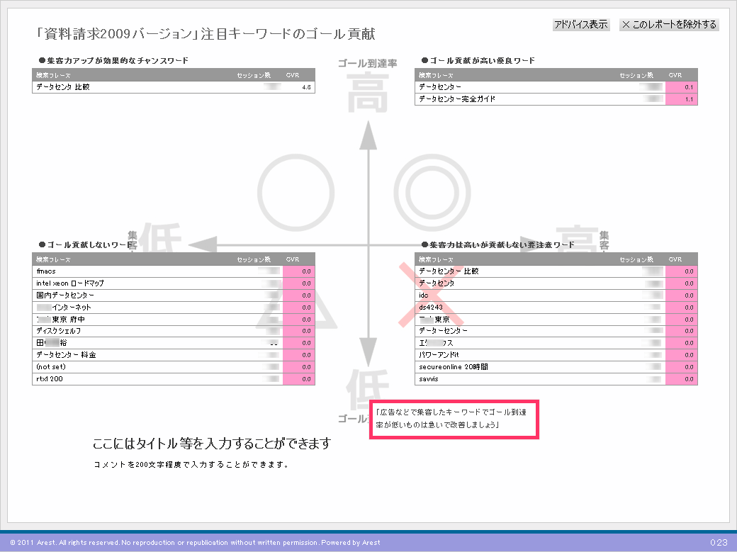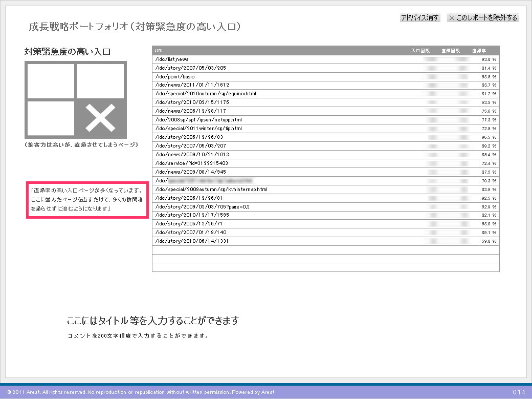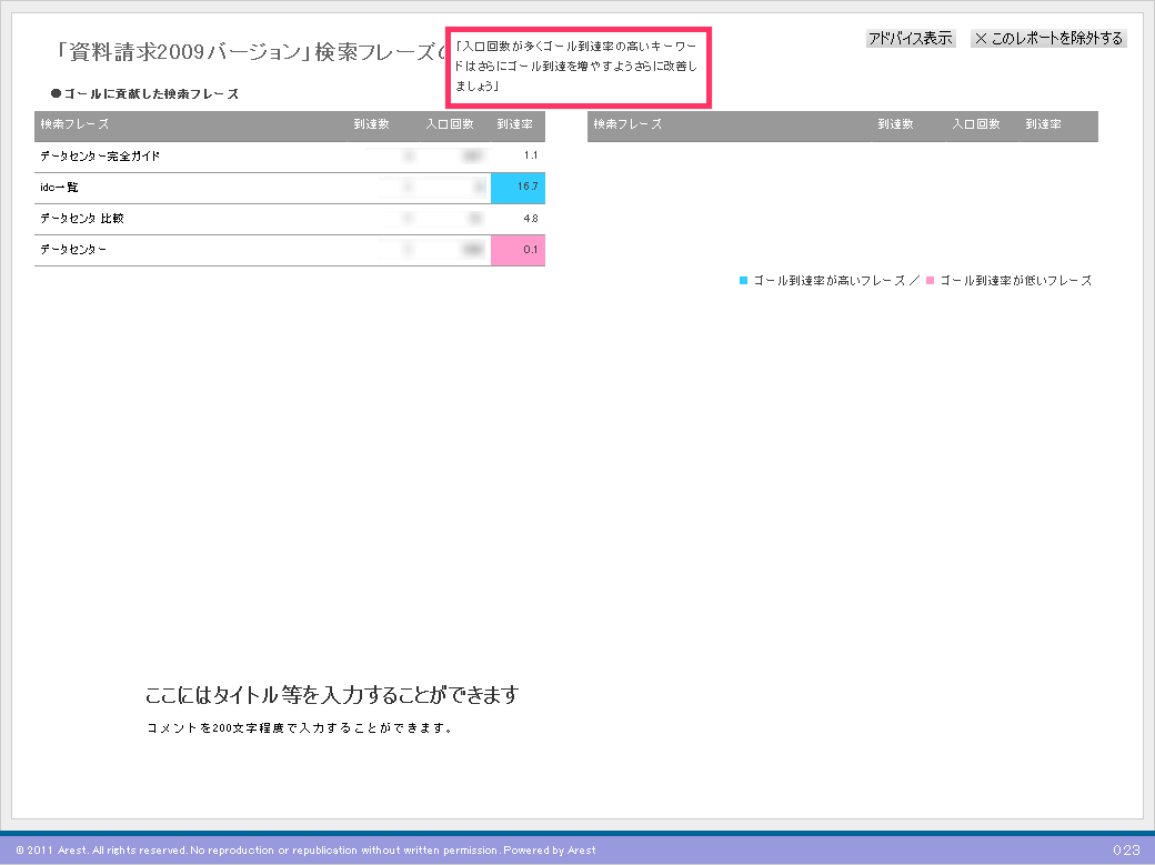 レポート例の図のなかで赤枠で囲んだコメントが表示されているものがあるが、これはアレストの自動アドバイス機能によってレポート上に表示されているアドバイスのメッセージだ。